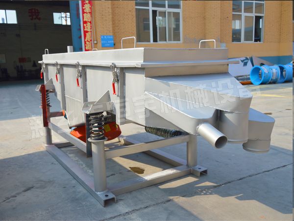 直線振動篩由篩箱、振動電機、減振系統(tǒng)及底架等組成。篩箱由槽體、上蓋、進料口、篩框、篩板(網(wǎng))、襯網(wǎng)、出料口等組成。減振系統(tǒng)由阻尼彈簧和彈簧座等組成。